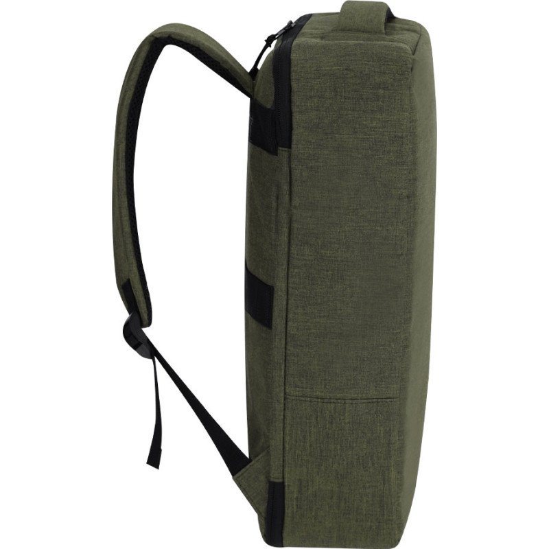 Document holder backpack made from durable RPET 300D. It features an urban design that incorporates a main pocket with a hidden zipper closure for added protection, with dual pullers. Includes a padded interior for laptops up to 15 inches, additional pockets inside for small items. Its shoulder straps and back are padded and adjustable for added comfort. Offers three transport modes: as a backpack, thanks to the padded shoulder straps; as a document holder, thanks to its carrying handle; and a strap for a trolley. The RPET material is made from recycled plastic, promoting the reuse of plastic waste and helping the planet's sustainability.
